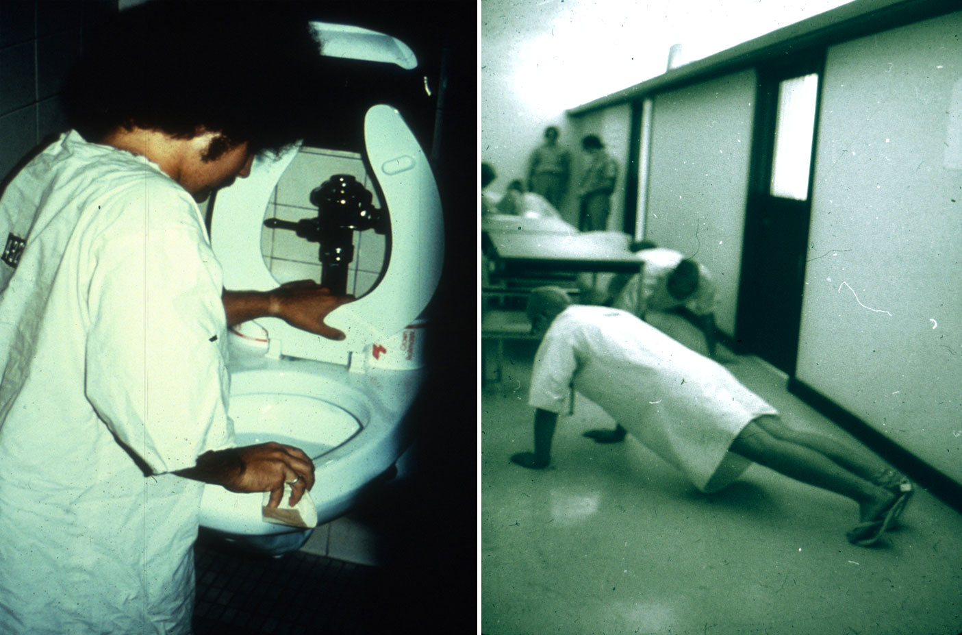 Здесь охранники заставили «заключенных» раздеться, надеть кандалы и халаты, а затем поместили их в условные «камеры», в которых не было никаких удобств, кроме матраса.
