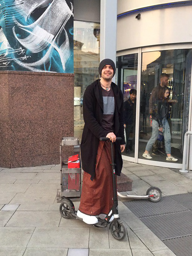 Недавно три юбки мне привезла из Мьянмы жена, и мне страшно захотелось в них выйти куда‑то, потому что они очень красивые. Мы сходили в торговый центр, потом погоняли на самокатах в центре и поужинали в ресторане в стиле 90-х. Я там отлично смотрелся.