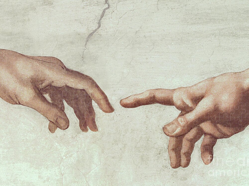 Прослушать публикациюТифлокомментарий: на фото — фрагмент фрески Микеланджело «Сотворение Адама». Две мужские руки тянутся друг к другу и почти касаются указательными пальцами. Рука справа дает более активный посыл навстречу, а кисть руки слева выглядит расслабленной — принимающей импульс.