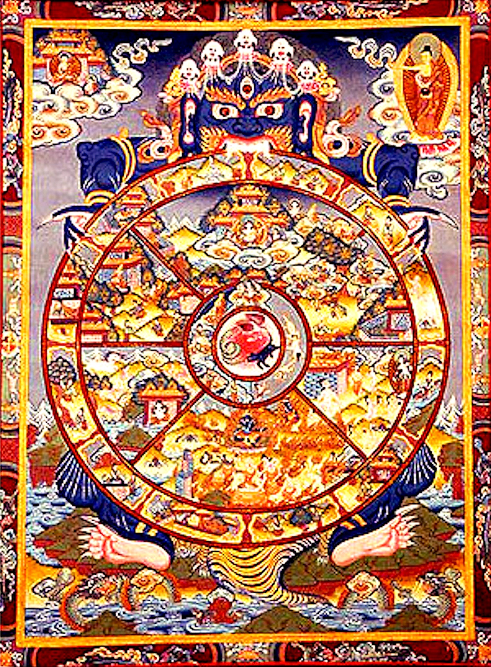 Колесо сансары — в буддийской религии бесконечный круг перерождений. В зависимости от накопленных душой хороших и плохих деяний она перерождается в одном из шести миров. В каждом из них есть страдания, но только в человеческом мире можно сознательно совершать благодеяния, что позволяет в конце концов вырваться из колеса и достичь вечного блаженства в нирване.