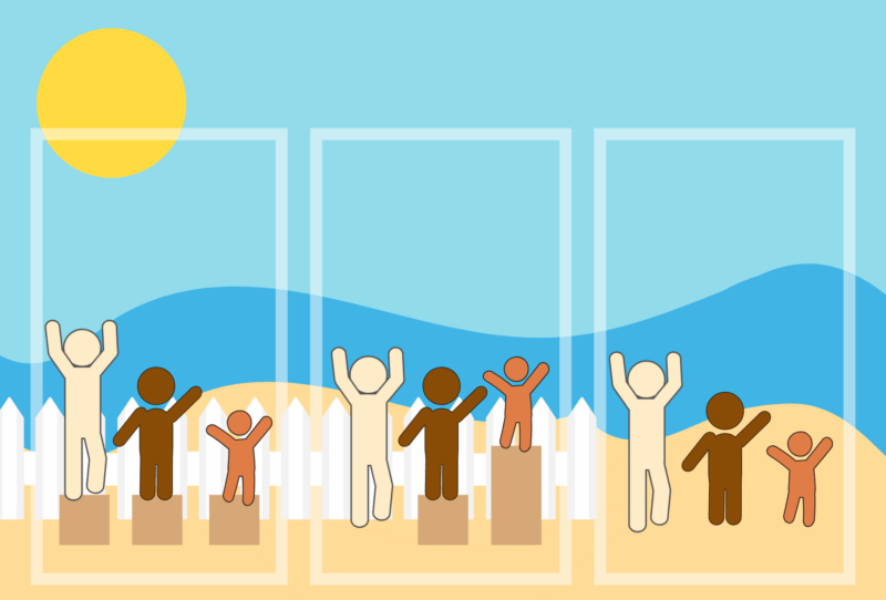 На первом изображении, представляющем равенство, молодые люди стоят на коробках из та же высота — они получают ту же помощь при просмотре забора, которая помогает высокому мальчику справа видеть через забор, но не помогает невысокой девочке слева.